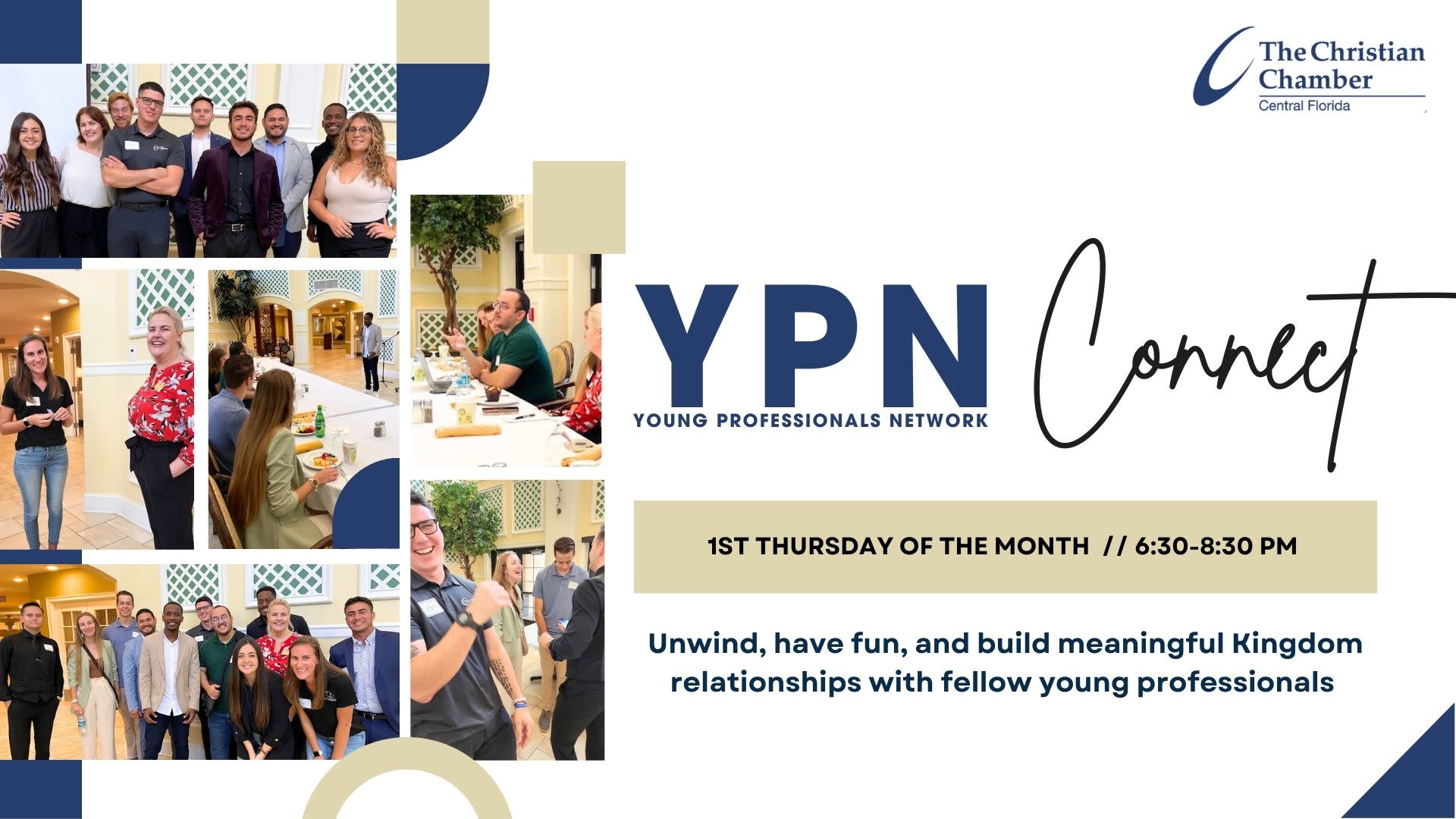 Join us for a laid-back evening at First Thursdays YPN Connect!Enjoy a relaxed atmosphere where you can unwind, have fun, and build meaningful Kingdom relationships with fellow young professionals. Experience genuine connections, great conversations, and a unique opportunity to blend faith and business.