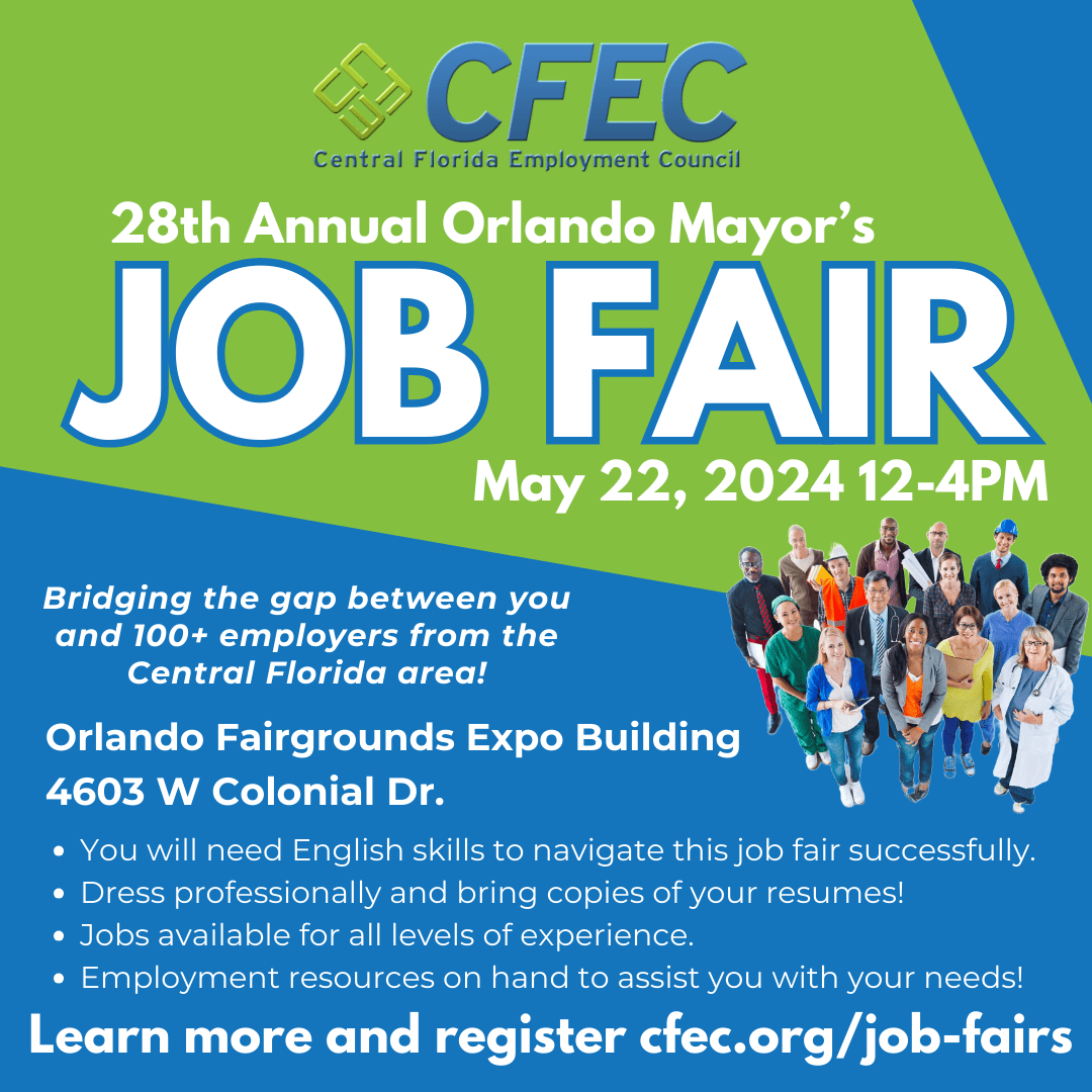 All Job Seekers Welcome! Meet, network and interview with nearly 100 companies from around the Central Florida region waiting to hire you! Find your next employer at the Central Florida Employment Council | CFEC Job Fair in Orlando, Florida, from 12-4 pm at the Orlando Fairgrounds Expo Building, 4603 W. Colonial Drive, Orlando, FL 32808. This is an indoor event – rain or shine. Thousands of career openings in various industries as well as employment resources on hand to assist your job search. Dress interview ready; bring plenty of resumes, free admission/parking, and no children, please. Register as a job seeker today www.cfec.org.