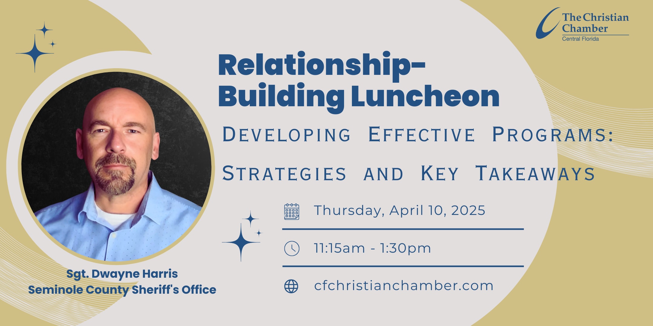 Join us for our next luncheon with Sgt. Dwayne Harris of the Seminole County Sheriff's Office, a leader in behavioral services and community-based intervention. As a sergeant in the Behavioral Services Unit, Sgt. Harris oversees opioid awareness programs, mental health intervention, and community training initiatives—all designed to create lasting change.